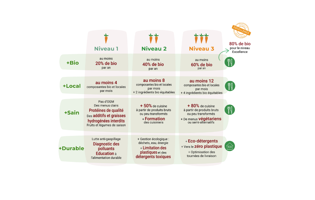 Le label² repose sur une progression en trois niveaux de labellisation (1, 2 et 3 carottes). Plus le niveau est élevé, plus les exigences augmentent. Cela se traduit par une part croissante de produits issus de l’agriculture biologique (de 20 % à au moins 60 %, jusqu’à 80 % pour le niveau Excellence), un recours renforcé à des composantes bio et locales, une cuisine davantage réalisée à partir de produits bruts ou peu transformés, sans OGM ni graisses hydrogénées, avec des menus clairs, équilibrés et environnementaux exigeants : lutte contre le gaspillage alimentaire, gestion responsable des déchets, de l’eau et de l’énergie, réduction des plastiques, utilisation d’éco-détergents et actions de sensibilisation.