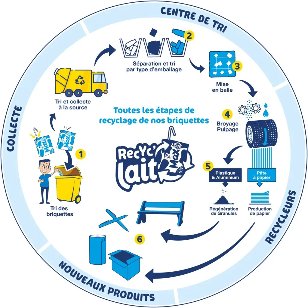 Le passage des pailles plastique aux pailles en papier répond également à d’autres aspects écologiques. Chaque année c’est 4.8T de plastique qui sont consommés pour ces pailles, et qui vont être dorénavant évités. Cette paille va également pouvoir être recyclée avec la briquette en carton. Pour mieux comprendre le cycle de vie de nos briquettes et pailles Lactel MAX, découvrez la démarche Recyc’lait ! 4 étapes simple de recyclage permettant de donner une nouvelle fonction aux briquettes de lait après leur consommation.