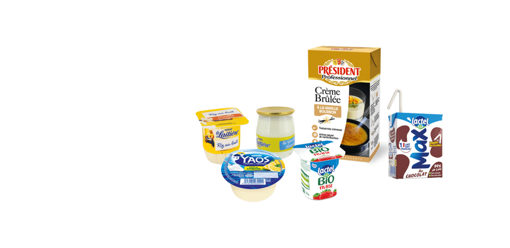 ² Yaourts : 13,5 g pour 100g / Desserts : 18 g pour 100 g / Laits aromatisés : 10,5 g pour 100g. 85% du volume produits laitiers sucrés des marques LACTALIS respectent les seuils de taux de sucres en 2023.