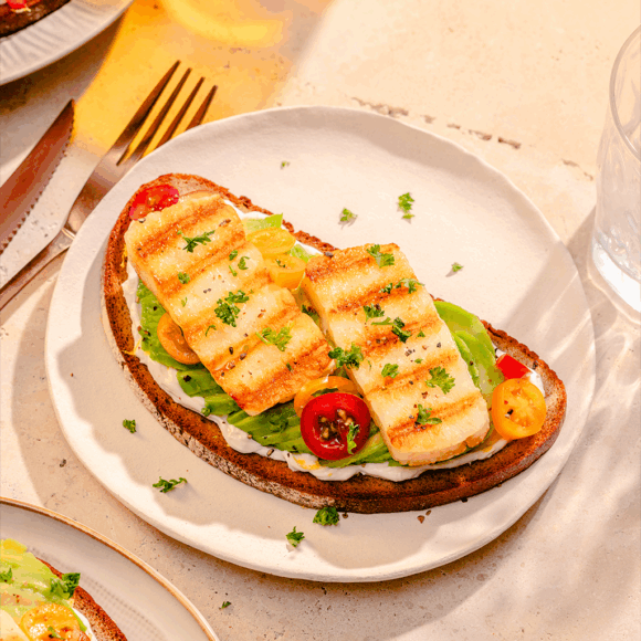 Dans une poêle préchauffée à feu moyenvif, faire cuire les tranches de halloumi de 4 cm de large, 7 cm de long et 0,5 cm d’épaisseur, 2 ou 3 min de chaque côté. Disposer sur l’avocat.