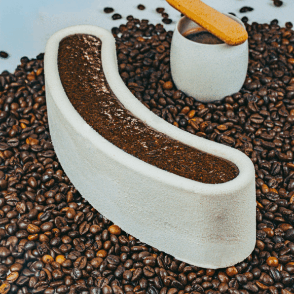 Garnir le moule à bûche de mousse mascarpone en premier, en lissant bien les parois et le fond avec une spatule pour éviter les bulles d’air. Sortir le crémeux du congélateur et le déposer au centre, en l’enfonçant légèrement dans la mousse, recouvrir du praliné café et ensuite une autre couche de mousse. Déposer le biscuit au cacao préalablement imbibé avec le sirop café, appuyer légèrement pour souder avec la mousse. Terminer par une fine couche de mousse pour lisser. Lisser à la spatule et puis mettre au congélateur une nuit pour que la bûche soit bien figée et puisse être démoulée net ? Démouler la bûche congelée, floquer pour l’effet velours et ensuite laisser décongeler doucement au réfrigérateur.