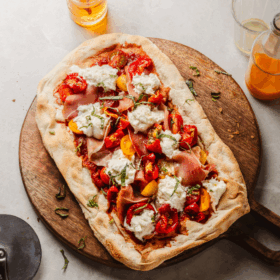 Pinsa Stracciatella, tomates et jambon cru