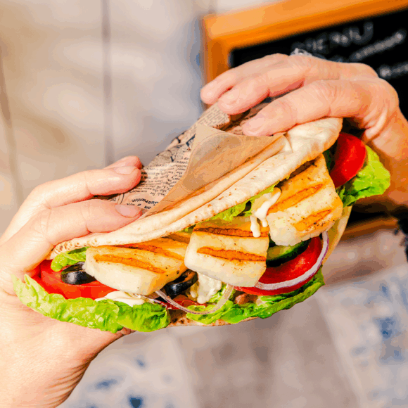 Étaler la sauce yaourt à l’intérieur du pain pita, ajouter ensuite de la salade sucrine, la salade de tomates et terminer par le halloumi grillé au centre.