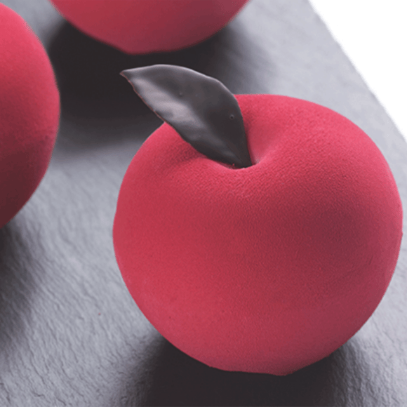 Râper si nécessaire le bord des coques de meringue pour faciliter l’assemblage. Dans le fond d’une coque meringue, déposer une noisette de confiture de lait, compléter à hauteur avec les pommes caramel, ajouter une brunoise de pommes granny (légèrement citronnée). Remplir l’autre demi-coque de chantilly, et assembler les 2 coques. Pulvériser un velours rouge pour imiter la pomme et terminer avec une feuille de chocolat.
