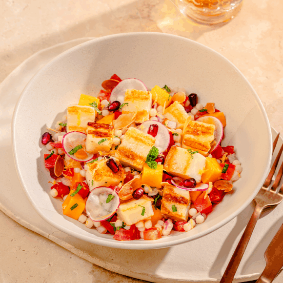 Cuire le couscous perlé dans l’eau bouillante, puis retirer du feu et réserver pour refroidir. En attendant que le couscous refroidisse, couper les tomates en brunoise, ciseler finement les oignons rouges, couper les radis à la mandoline en fines lamelles, couper les mangues en petits cubes de 1 cm, effeuiller et ciseler la menthe, prélever les graines de grenade et ensuite mélanger l’ensemble. Torréfier les amandes effilées au four à 180°C pendant 8 min. Réserver. Couper le halloumi en cubes de 2,5 cm, griller avec un léger filet d’huile d’olive jusqu’à obtenir une belle coloration. Réserver. Préparer une vinaigrette avec l’huile d’olive, le jus et le jus des citrons, sel et poivre.